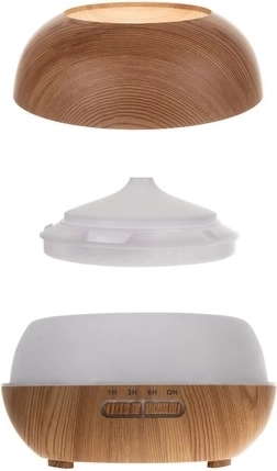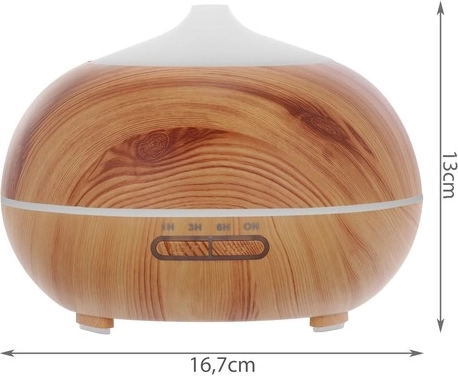 De bediening is uiterst comfortabel – er zijn 4 nevelstanden (groot/klein, continu/onderbroken), een timer 1/3/6 u en decoratieve LED-achtergrondverlichting. Met de afstandsbediening stel je alles gemakkelijk in vanaf de bank. Antislip siliconen voetjes houden de diffuser stabiel op zijn plek en de voedingskabel van 180 cm maakt het plaatsen eenvoudig.