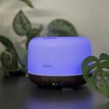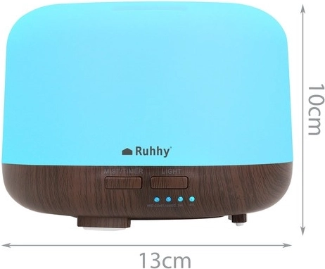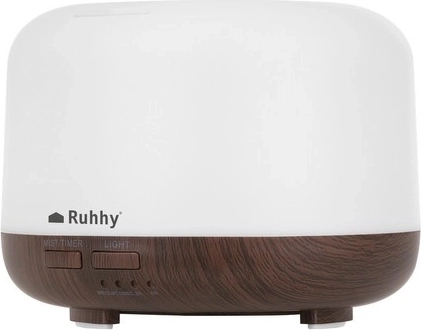 Stijlvolle RUHHY aromadiffuser en luchtbevochtiger 4-in-1bevochtiging, aromatherapie, ionisatie en LED-achtergrondverlichting. Dankzij het reservoir van 300 ml, de stille werking, timer 2/4 u, 4 nevelstanden en tot 8 kleuren licht creëer je met één druk op de afstandsbediening de ideale sfeer. De compacte afmetingen 13,2 × 10 cm passen in elke kamer.
