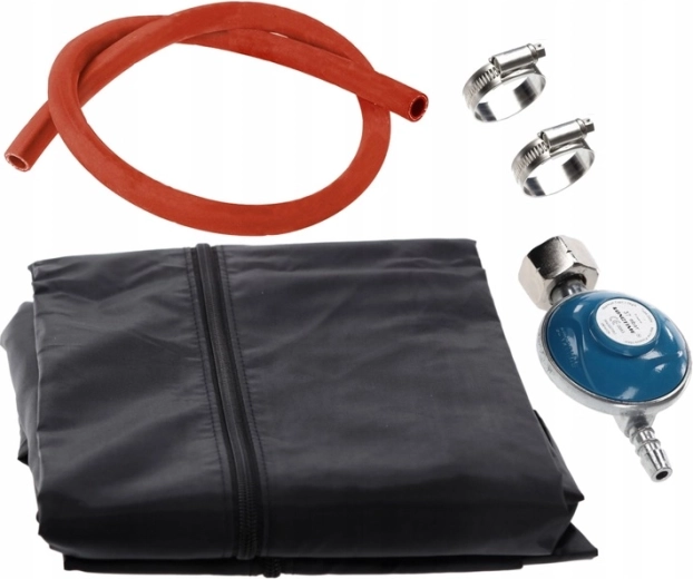 In de verpakking zitten een gasslang, drukregelaar en beschermhoes – na montage kun je direct verwarmen.