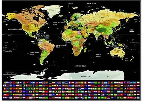 Decoratieve kaart waarmee reizigers bezochte landen kunnen markeren door de bovenlaag te verwijderen. Daaronder verschijnen kleurrijke vlaggen en details van afzonderlijke landen.