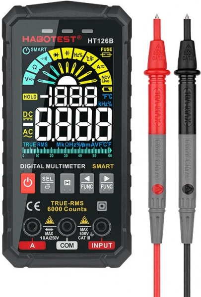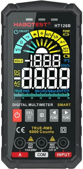 De HABOTEST-multimeter is ontworpen voor nauwkeurig en comfortabel meten, zowel in het veld als in de werkplaats. Dankzij true‑RMS levert hij betrouwbare resultaten bij niet-lineaire signalen, 6000 counts zorgt voor een fijne resolutie en het grote VA‑display met achtergrondverlichting biedt uitstekende leesbaarheid. Siliconen knoppen, een LED-zaklamp en de compacte behuizing (ca. 146 × 72 × 26 mm, 182 g) verhogen het comfort, ook onder zware omstandigheden.