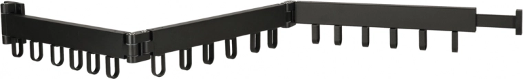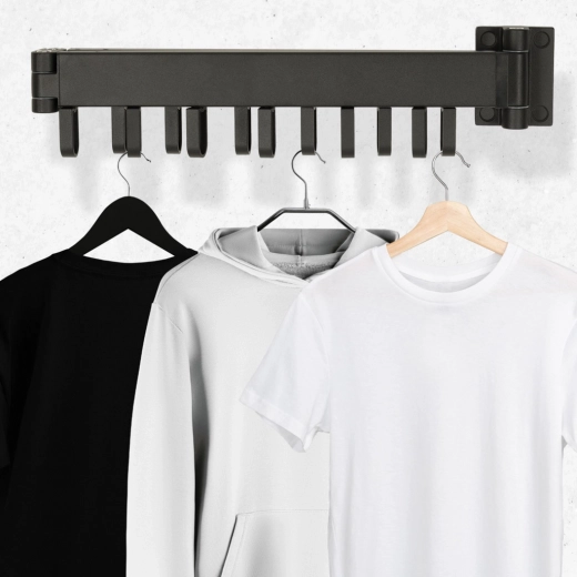 De hoeklat met vaste haken en scharnier maakt praktische opslag langs de muur mogelijk en wordt alleen uitgeklapt wanneer nodig.