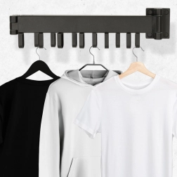Creëer orde in huis en bespaar ruimte met dit slimme wanddroogrek dat zich aanpast aan jouw behoeften. De telescopische arm kan worden uitgeschoven tot 90 cm, zodat je meerdere kledingstukken tegelijk kwijt kunt, en na het drogen klap je hem eenvoudig tegen de muur. Het minimalistische maar duurzame metalen design past perfect in zowel moderne als klassieke interieurs.