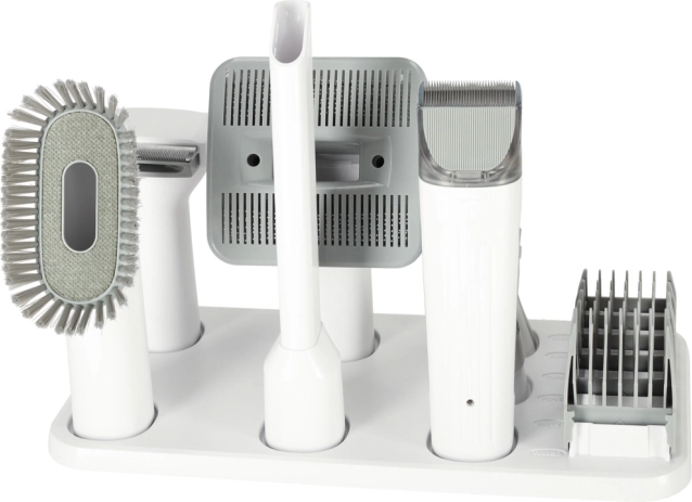 Bijgeleverd is een draadloze tondeuse met zes opzetkammen (3–23 mm) voor nauwkeurige styling van de vacht, ontklitborstels en tools voor poot- en nagelverzorging. De drie zuigstanden passen eenvoudig bij gevoelige dieren, terwijl het effectieve filter helpt stof en allergenen in huis te verminderen.