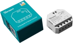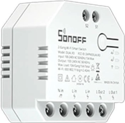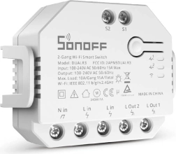 Compacte slimme schakelaar SONOFF Dual R3 met twee onafhankelijke kanalen en energiebewakingsfunctie voor het bedienen van verlichting, stopcontactcircuits en jaloezieën of rolluiken. Verbindt via Wi‑Fi 2,4 GHz, werkt met de eWeLink-app, biedt tijdschema’s en is TÜV-gecertificeerd voor extra veiligheid.