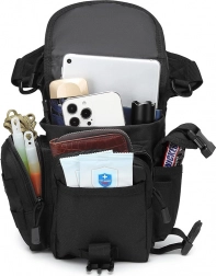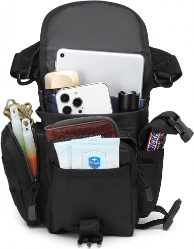 Zes praktische vakken en een interne indeling houden telefoon, portemonnee, gereedschap en kleine spullen overzichtelijk en veilig. Een apart vak voor zaklamp/pen en een houder voor een karabijnhaak verhogen de functionaliteit.