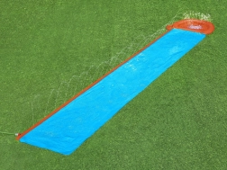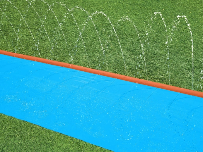 Deze glijbaan is uitgerust met een watersproeisysteem dat zorgt voor optimale bevochtiging van het oppervlak en gemakkelijk glijden mogelijk maakt. Geïntegreerde stralen worden geactiveerd bij aansluiting van een tuinslang. De constructie zorgt voor een zachte en veilige afwerking dankzij het opblaasbare einde. Gemaakt van duurzaam vinyl, garandeert langdurig gebruik.