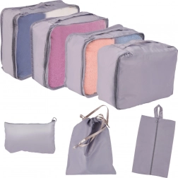 Vier cubes voor kleding, een schoenenzak, een zak en een klein tasje voor accessoires – allemaal stijlvol op elkaar afgestemd in één pakket.