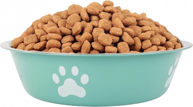 De turquoise bak met pootjesprint ziet er geweldig uit en is geschikt voor honden en katten voor dagelijkse maaltijden.