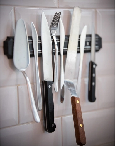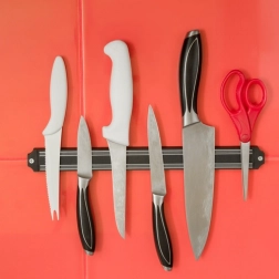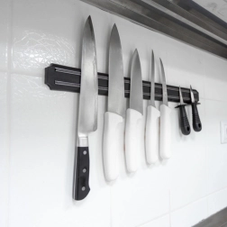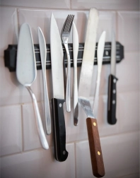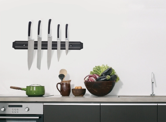Eén strip – veel mogelijkheden. Draagt keukenmessen, gardes, scharen en gereedschap in de werkplaats. Orde en overzicht op een klein oppervlak.