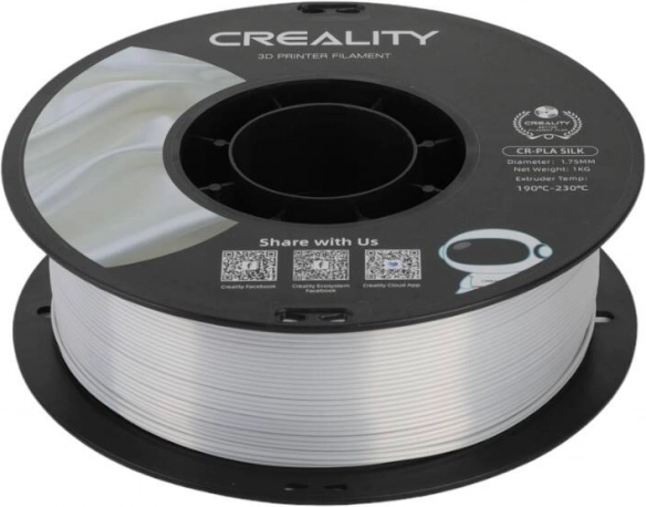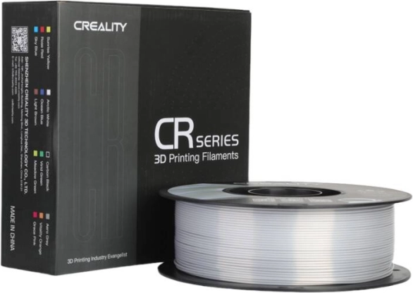 De glanzende Creality CR-PLA Silk filament in zilver geeft een metallic, elegante glans voor figuren, decoraties en sieraden. Biedt snelle en vloeiende print tot 100 mm/s, anti-klit bestendigheid, lage krimp en is gemaakt van milieuvriendelijke PLA. Compatibel met de meeste CREALITY-printers.