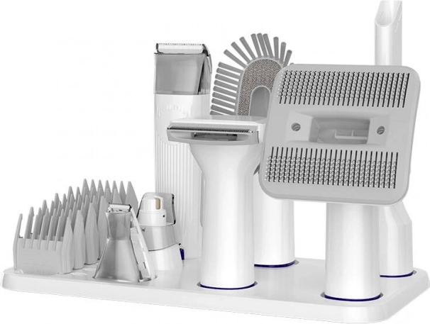 In de verpakking zit een precieze trimmer voor de haren tussen de voetzooltjes, een nagelvijl en meerdere opzetstukken voor verschillende lengtes en vachtsoorten. Dankzij het ruime 1,5 l-reservoir en de praktische opbergaccessoires is het onderhoud eenvoudig en hygiënisch – de ideale oplossing voor dagelijkse verzorging thuis.