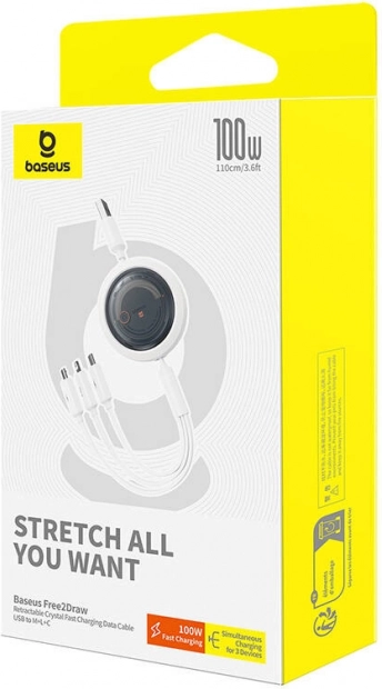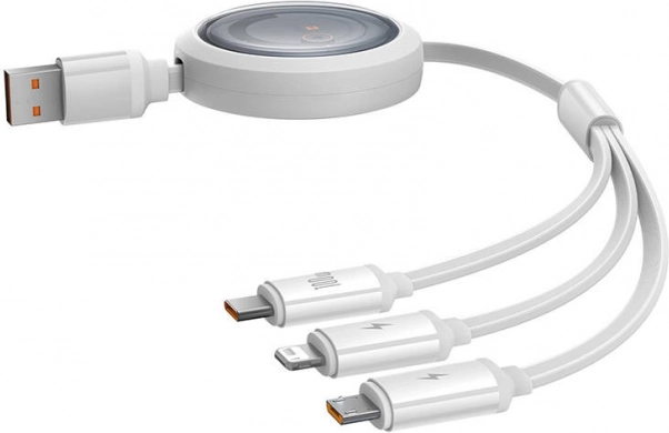 Universele uittrekbare kabel BASEUS Free2Draw met USB‑C, Lightning en Micro USB‑connectors waarmee je tot 3 apparaten tegelijk kunt opladen. Dankzij het vermogen van 100 W en de gegevensoverdracht van 480 Mb/s is hij ideaal voor telefoons, tablets en accessoires. De compacte haspel voorkomt in de knoop raken en maakt meenemen eenvoudig.