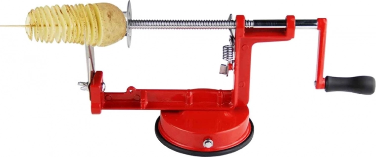 Plaats de aardappel, draai aan de slinger en je hebt in een mum van tijd lange spiralen klaar om 3–4 minuten te frituren.