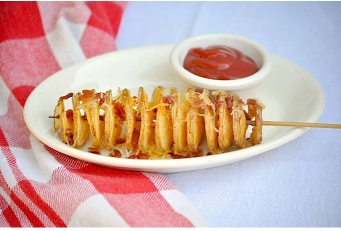 Serveer spiraalaardappels op een stokje met je favoriete dips en kruiden – een opvallende snack die zowel kinderen als volwassenen blij maakt.