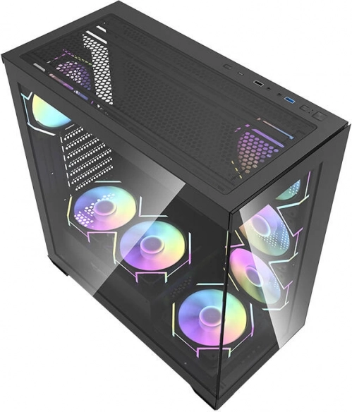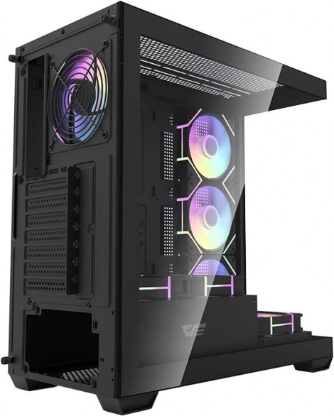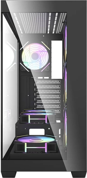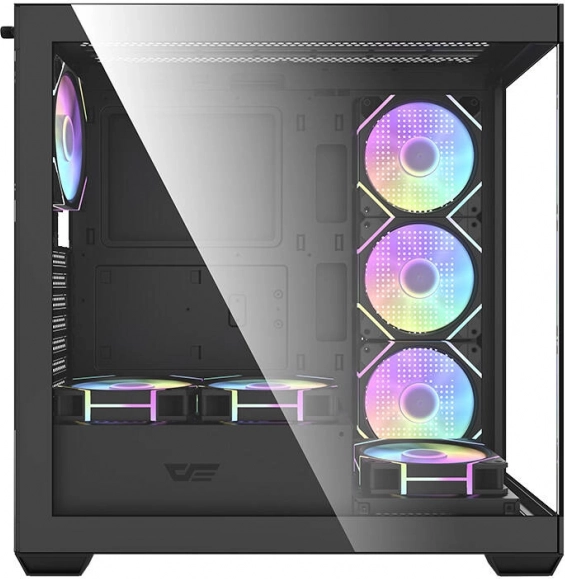 De Darkflash DS900 is een moderne midi‑tower voor veeleisende gamers en contentcreators. Het panoramische chassis met dubbel gehard glas biedt vrij zicht op de componenten en ARGB‑verlichting, terwijl de robuuste constructie van 0,5 mm SPCC duurzaamheid en stabiliteit garandeert. Standaard inbegrepen zijn 7× 120 mm ARGB‑ventilatoren voor directe, efficiënte koeling en een opvallende look.