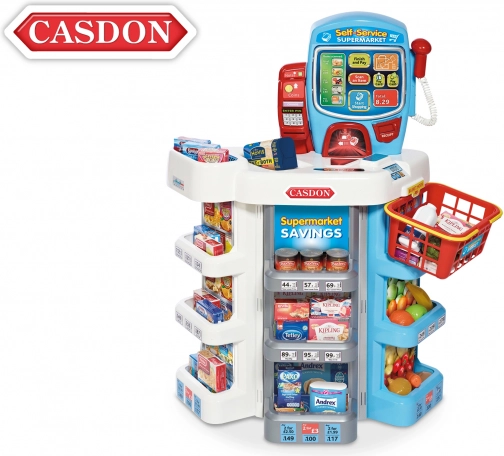 Stijlvolle zelfbedieningskassa voor kinderen van Casdon maakt winkeltje spelen tot een echte beleving: biedt realistische geluiden, een aanraakscherm en een elektronisch display. Inclusief chip-and-pin-terminal, scanner, bankbiljetten en munten, voedselreplica's en een boodschappenmandje. Hoogte 75 cm, geschikt vanaf 3 jaar.