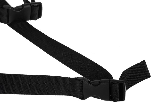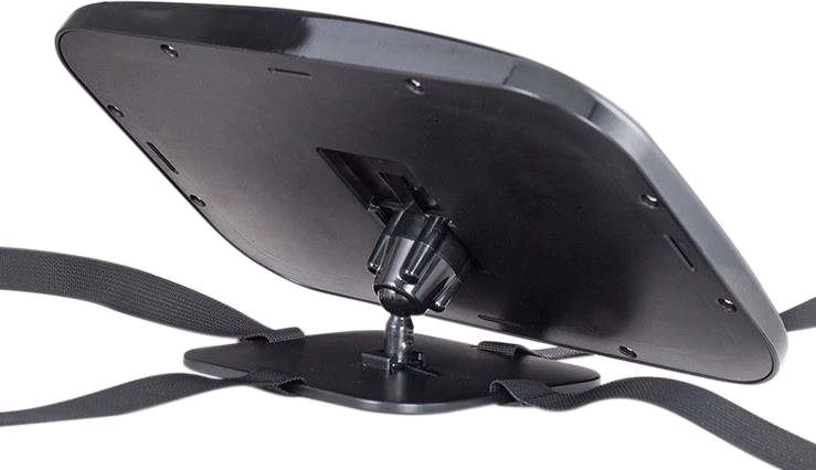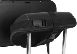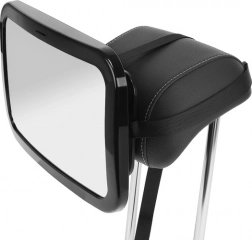 Vier verstelbare riemen (verticaal en horizontaal) met stevige gespen houden de spiegel betrouwbaar op de hoofdsteun zonder wiebelen of wegglijden.