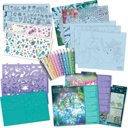 In de doos vind je een kleurrijk palet aan tekenspullen en accessoires waarmee kinderen kunnen overtrekken, inkleuren, tekenen en plakken. Dankzij de duidelijke stap-voor-stap handleidingen leren ze snel nieuwe technieken en maken ze prachtige afbeeldingen geïnspireerd door de magische dierenwereld.