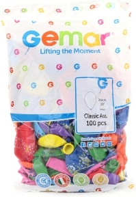 Kleurrijke ballonnen van het merk Gemar in een verpakking van 100 stuks, ideaal voor decoratie en feesten, voegen aan elke gelegenheid levendigheid en plezier toe.