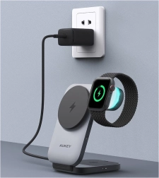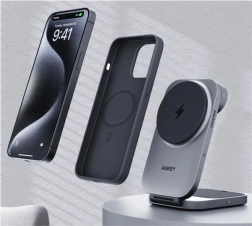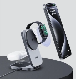 Geniet van snel en veilig draadloos laden voor al je Apple‑apparatuur in één compact station. AUKEY MagFusion maakt gebruik van Qi2 met tot 15 W voor iPhone en laadt tegelijk Apple Watch en de oplaadcase van AirPods. De stabiele magnetische bevestiging en verstelbare hoek maken het een ideale standaard voor videogesprekken en het bekijken van content.