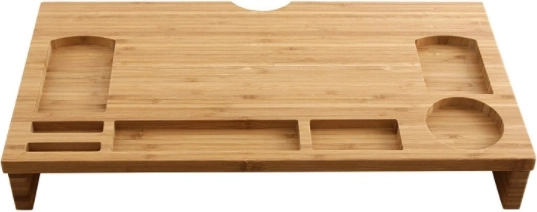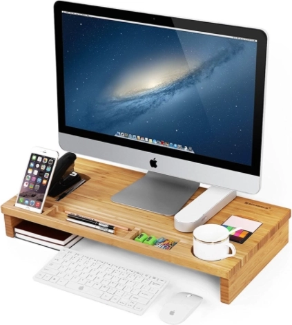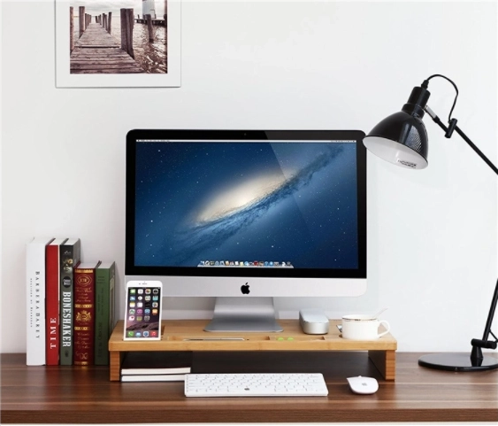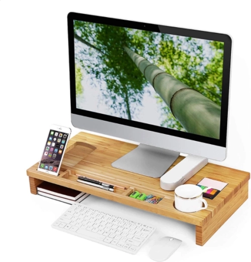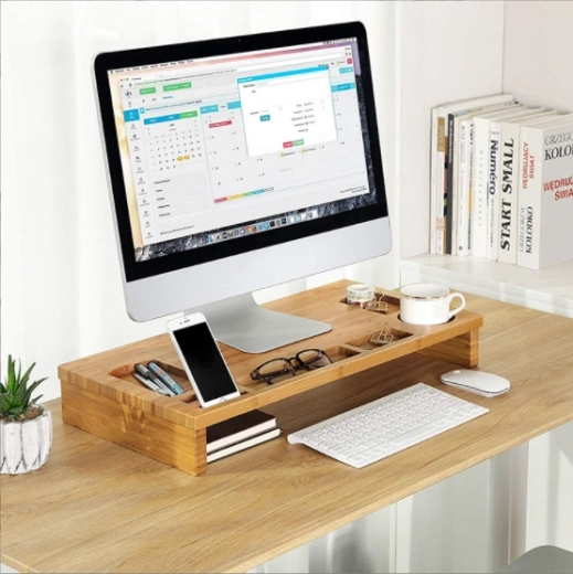 Elegante bamboe monitorstandaard die het scherm op ergonomische hoogte brengt en tegelijk dient als praktische organizer. Biedt vakjes voor telefoon, pennen en kleinigheden, een afgebakende plek voor een mok en ruimte voor toetsenbord en muis onder de standaard. De natuurlijke uitstraling en het duurzame bamboe zorgen voor een opgeruimd bureau en een comfortabelere werkhouding.
