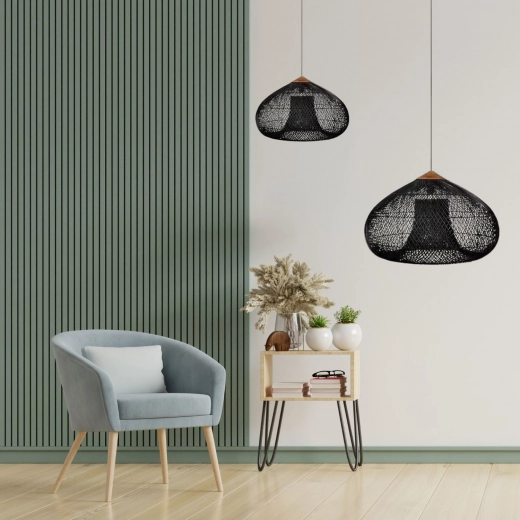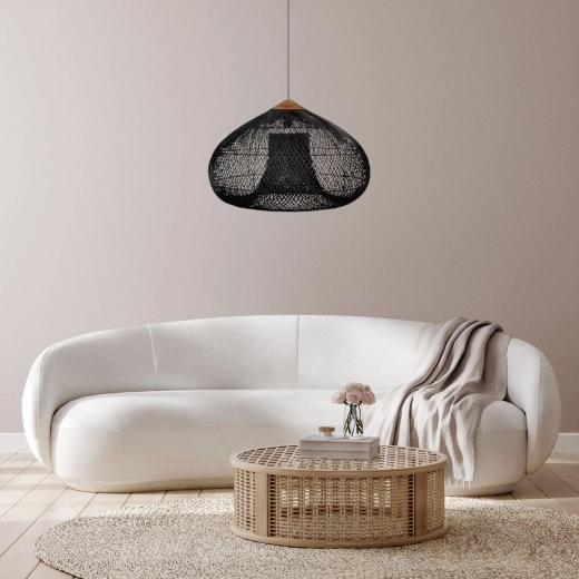 Onze hangende plafondlamp van rotan en hout, met een diameter van 40 cm en een hoogte van 35 cm, biedt een breed verlichtingsbereik dat een oppervlakte van 10 tot 15 m² bestrijkt. Het past perfect in zowel moderne als klassieke interieurs, ideaal voor woonkamers, eetkamers of slaapkamers.