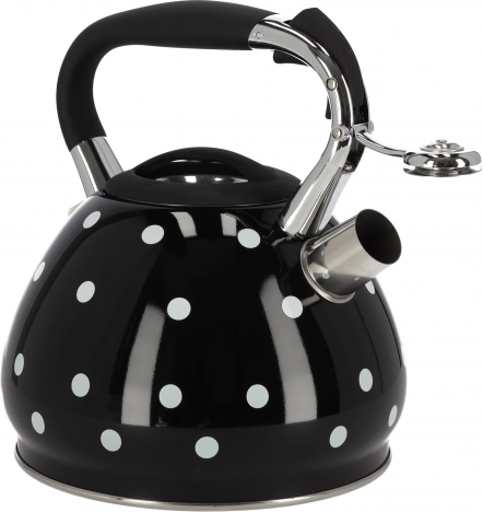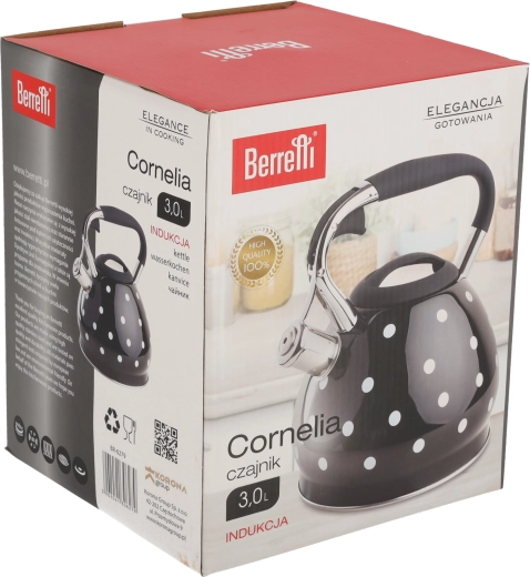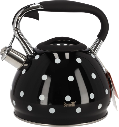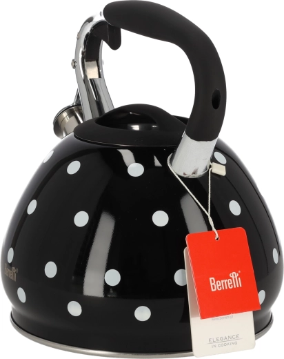 Berretti Cornelia 3L is een elegante fluitketel die je keuken een vleugje stijl geeft dankzij de zwarte kleur met witte stippen. Met een capaciteit van 3 liter is hij ideaal voor dagelijks gebruik, of het nu voor thee zetten of koffie bereiden is.