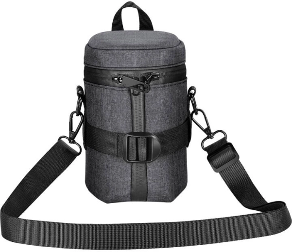 De zijrits maakt het mogelijk de capaciteit met 27 mm uit te breiden, waardoor gangbare lenzen voor DSLR en systeemcamera’s comfortabel passen tot circa 100 × 140 mm (diameter × hoogte). De lichte constructie van duurzame polyester is spatwaterbestendig en dankzij de achterste gesp, klittenbandlus en schouderriem bevestig je de tas eenvoudig aan je riem of rugzak, of draag je hem comfortabel over de schouder.