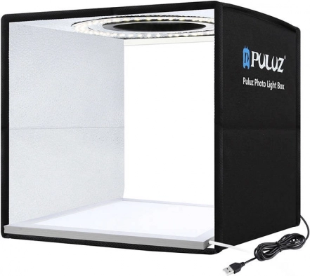 Compacte mini fotostudio PULUZ van 25 × 25 × 25 cm met een ringverlichting van 96 LED’s (type 2835) en hoge kleurnauwkeurigheid CRI >95 voor topproductfotografie zonder schaduwen. Biedt traploze dimming 1–100%, kleurentemperatuur 5500 K en USB‑voeding. De opvouwbare constructie, boven- en frontopnamen en 6 dubbelzijdige achtergronden helpen je overal perfecte resultaten te bereiken.