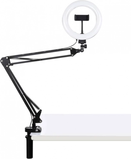 De robuuste metalen arm met dubbele veren houdt licht en telefoon stevig op hun plek, terwijl de schroefklem de standaard veilig aan tafelbladen van verschillende diktes bevestigt. Handige USB-voeding via laptop, pc of oplader en het lichte, draagbare ontwerp maken deze set ideaal voor vloggen, make-up, productfotografie en online meetings.