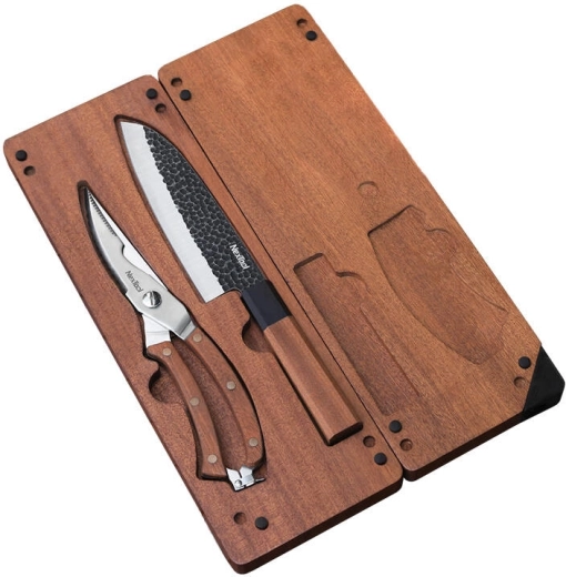 Inklapbare magnetische snijplank – De snijplank gemaakt van geïmporteerd sapele hout is uitgerust met een magneet voor stabiliteit tijdens het snijden. Het is inklapbaar en gemakkelijk op te bergen.