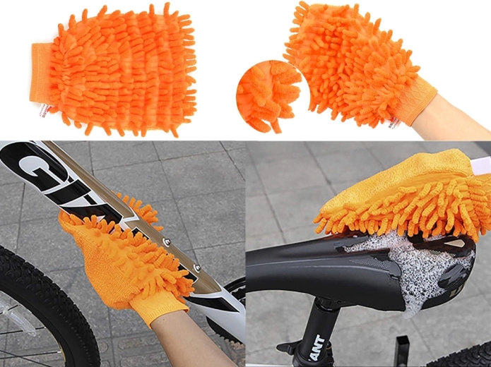De absorberende handschoen van fijn microvezel reinigt veilig het frame, de voorvork en gevoelige onderdelen en laat een streeploos oppervlak achter.