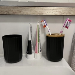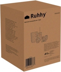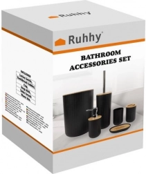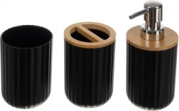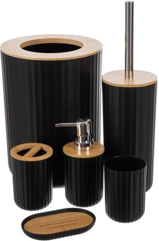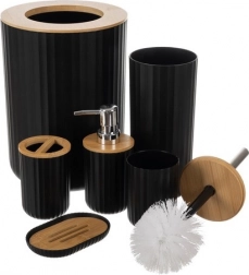 In de set vindt u alles voor netheid en orde: een zeepdispenser met metalen pompje, een zeepbakje met bamboe inzet voor waterafvoer, een beker, een tandenborstelhouder met bamboedeksel en openingen, een WC-borstel met roestvrijstalen handgreep en een prullenbak met brede ronde opening voor eenvoudig vervangen van de zak.
