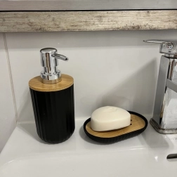 Het zeepbakje met bamboe inzet houdt de zeep droog, de dispenser met metalen pompje is ideaal voor vloeibare zeep of gel.
