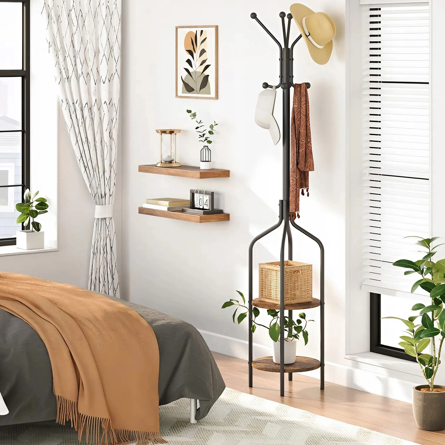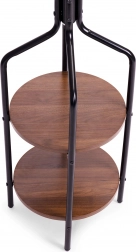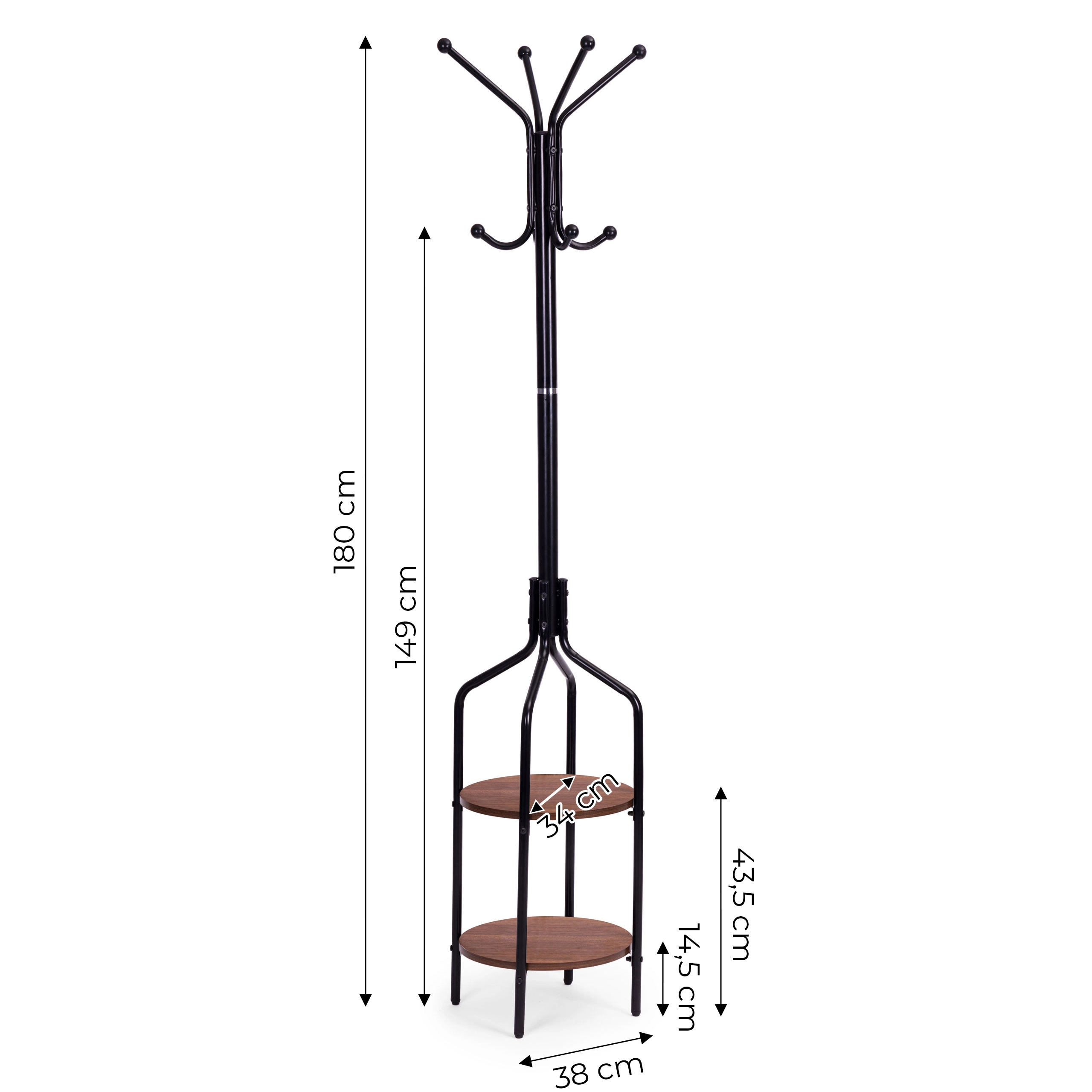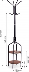 Het bovenste deel heeft vier armen, die 8 plekken om kleding op te hangen bieden. Het onderste deel is uitgerust met twee functionele planken in rustiek bruin. De constructie is gemaakt van poedergecoat metaal en de basis van 4 verbrede pootjes, die stabiliteit zelfs bij zware belasting garanderen. Elk pootje is afgewerkt met een dop die uw vloer tegen krassen beschermt.