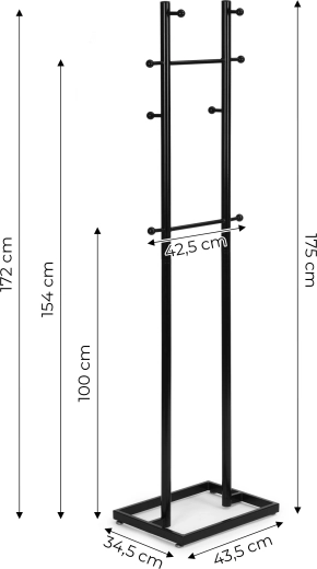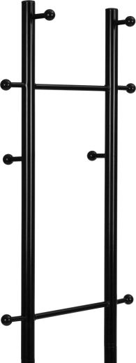 Orde binnen handbereik. Deze moderne staande kapstok in matzwart past perfect in elke hal, kleedruimte of kantoor. Poedergecoat metaal zorgt voor krasbestendigheid en een lange levensduur, terwijl de doordachte plaatsing van 8 haken op verschillende hoogtes comfortabel plaats biedt aan mantels, jassen, tassen en hoeden.