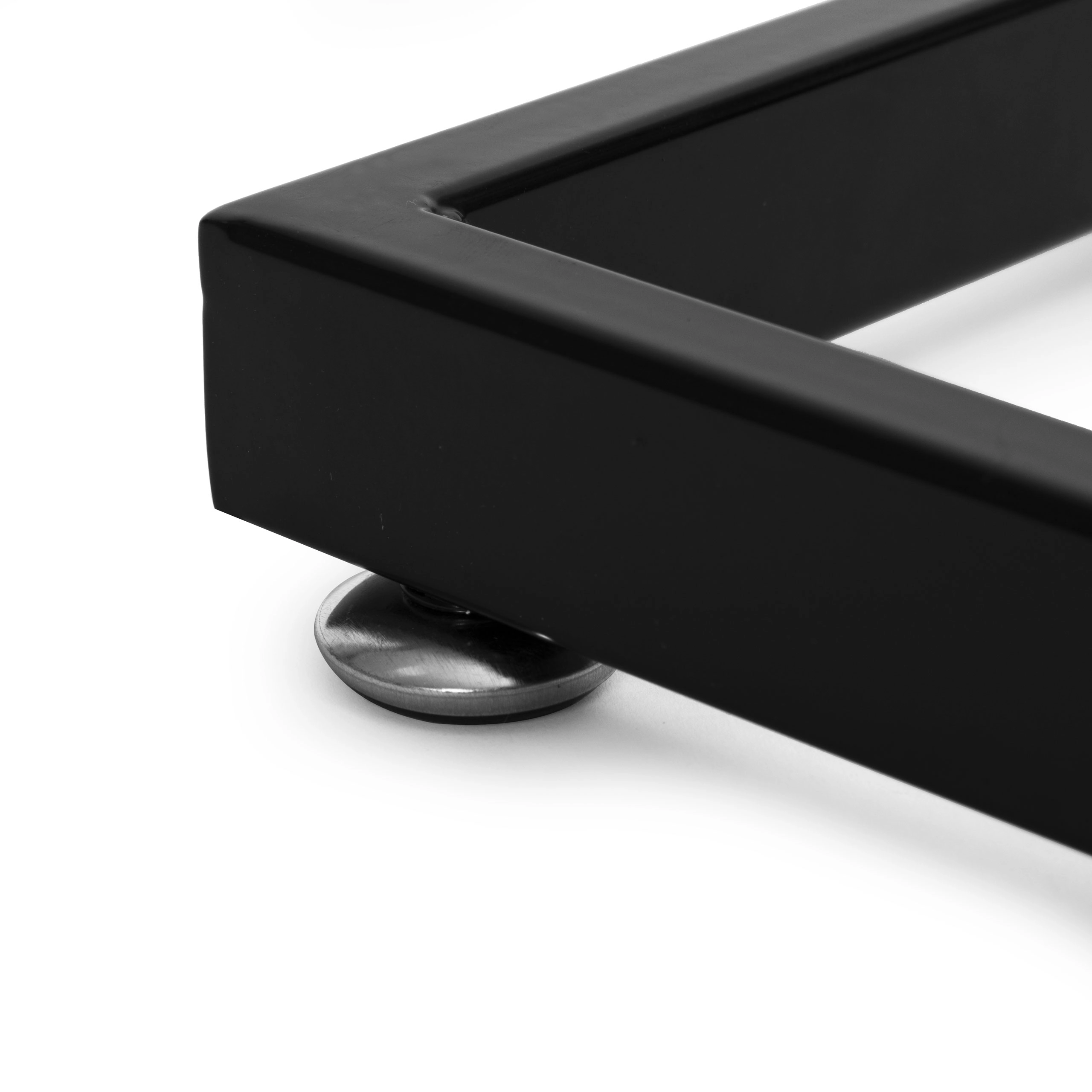 De robuuste rechthoekige basis van metalen profielen houdt de kapstok stabiel, zelfs bij volledige belasting. Verstelbare stelvoetjes beschermen vloeren tegen beschadiging en helpen de kapstok te nivelleren op een oneffen ondergrond. Het eenvoudige, universele ontwerp combineert moeiteloos met moderne interieurs.