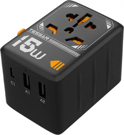 De universele TESSAN reisadapter met verwisselbare EU/UK/AU/US-stekkers en een vermogen tot 2500 W laat je apparaten veilig voeden overal ter wereld. Voorzien van 2× USB‑A en 1× USB‑C voor snel opladen van maximaal 3 apparaten tegelijk (tot 15 W via USB‑C). Het compacte formaat bespaart ruimte in je bagage en de verwisselbare zekering 250 V / 10 A biedt een hoog veiligheidsniveau.