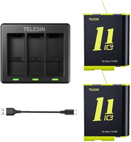 Inhoud van de verpakking: driekanaals Telesin-oplader, 2× oplaadbare batterij 1750 mAh, USB‑C-kabel.
