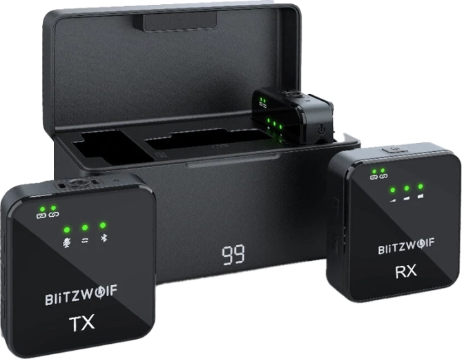 Betrouwbare 2,4G draadloze technologie zorgt voor een snelle overdracht over een afstand van ongeveer 10–25 m met hoge weerstand tegen interferentie. De zender gaat op één lading ongeveer 6–8 uur mee, de ontvanger ongeveer 8 uur, en het praktische oplaadetui met een capaciteit van 1000 mAh verlengt de inzet op locatie; volledig opladen duurt ongeveer 2 uur.