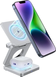 Gebruiksvriendelijk designDe 3-in-1 oplader is compact en draagbaar, wat opslag en transport eenvoudig maakt. Bovendien kun je de hoogte en hoek vrij instellen en zorgen hoogwaardige materialen voor een duurzaam product. Ideaal voor thuis en op kantoor, maar ook voor reizen of zakenreizen.