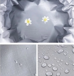 De LDPE-coating zorgt voor volledige waterdichtheid en bescherming tegen regen, sneeuw en vocht. Dubbelzijdige zilver-grijze uitvoering voor extra veelzijdigheid.