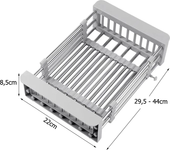 Praktisch telescopisch afdruiprek voor de gootsteen, dat soepel past op een breedte van 29,5–44 cm. Ideaal voor het wassen van fruit en groenten, het laten uitlekken van vaat en ruimtebesparing op het aanrecht. Duurzame combinatie van metaal en kunststof, eenvoudig onderhoud en een moderne grijze kleur.