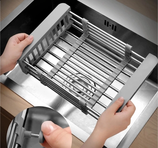 Dit uitschuifbare afdruiprek over de gootsteen vergroot het werkoppervlak en maakt dagelijkse keukenwerkzaamheden efficiënter. Dankzij de telescopische constructie past het op de meeste gootstenen en maakt het comfortabel afspoelen en drogen van fruit, groenten en vaat direct boven de spoelbak mogelijk.