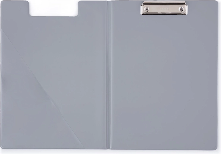 Afsluitbare schrijfonderlegger met metalen clip in een stijlvolle grijze kleur, gemaakt van extra stevig karton, ideaal voor het organiseren en beschermen van uw documenten.