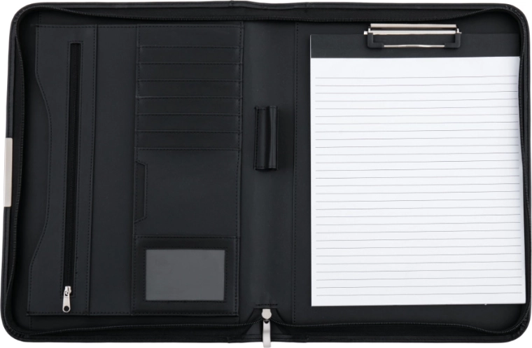 Elegante en functionele diplomatenmap in matzwart. Afsluitbaar met rits, ideaal voor vergaderingen en zakelijke besprekingen. Bevat een A4-blok en praktische vakken voor al uw benodigdheden.