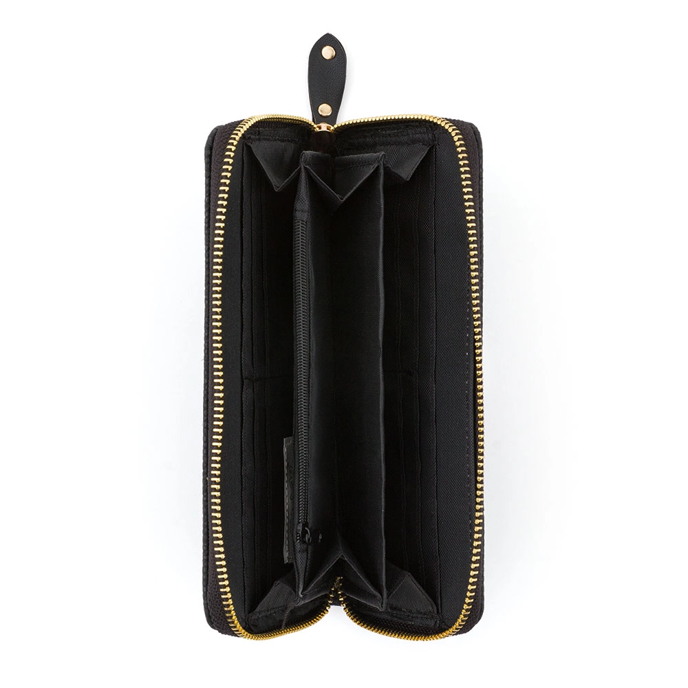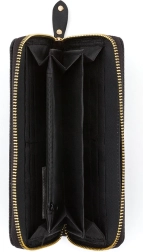 Stijlvolle damesportemonnee in elegant zwart, die voldoende ruimte biedt voor al je benodigdheden. Binnenin vind je 8 vakjes voor klantenkaarten, 2 grotere vakken, 3 gescheiden compartimenten voor contant geld en een afsluitbaar ritsvak voor kleingeld.