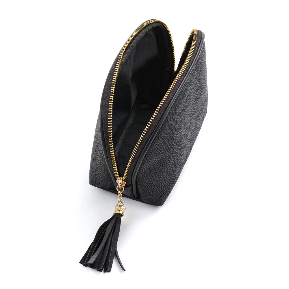 De cosmetische tas PLUS in het zwart is gemaakt van hoogwaardig leer, wat zorgt voor een lange levensduur en een elegante uitstraling. Praktisch niet alleen voor op reis, maar ook voor dagelijks gebruik thuis of op het werk.