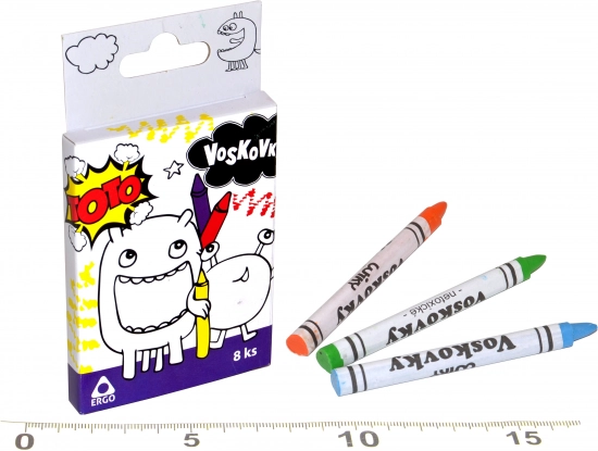 De set bevat acht gekleurde wasco's waarmee kleurrijke en levendige afbeeldingen gemaakt kunnen worden. De wasco's zijn verpakt in een compacte verpakking, wat ideaal is voor vervoer en opslag.